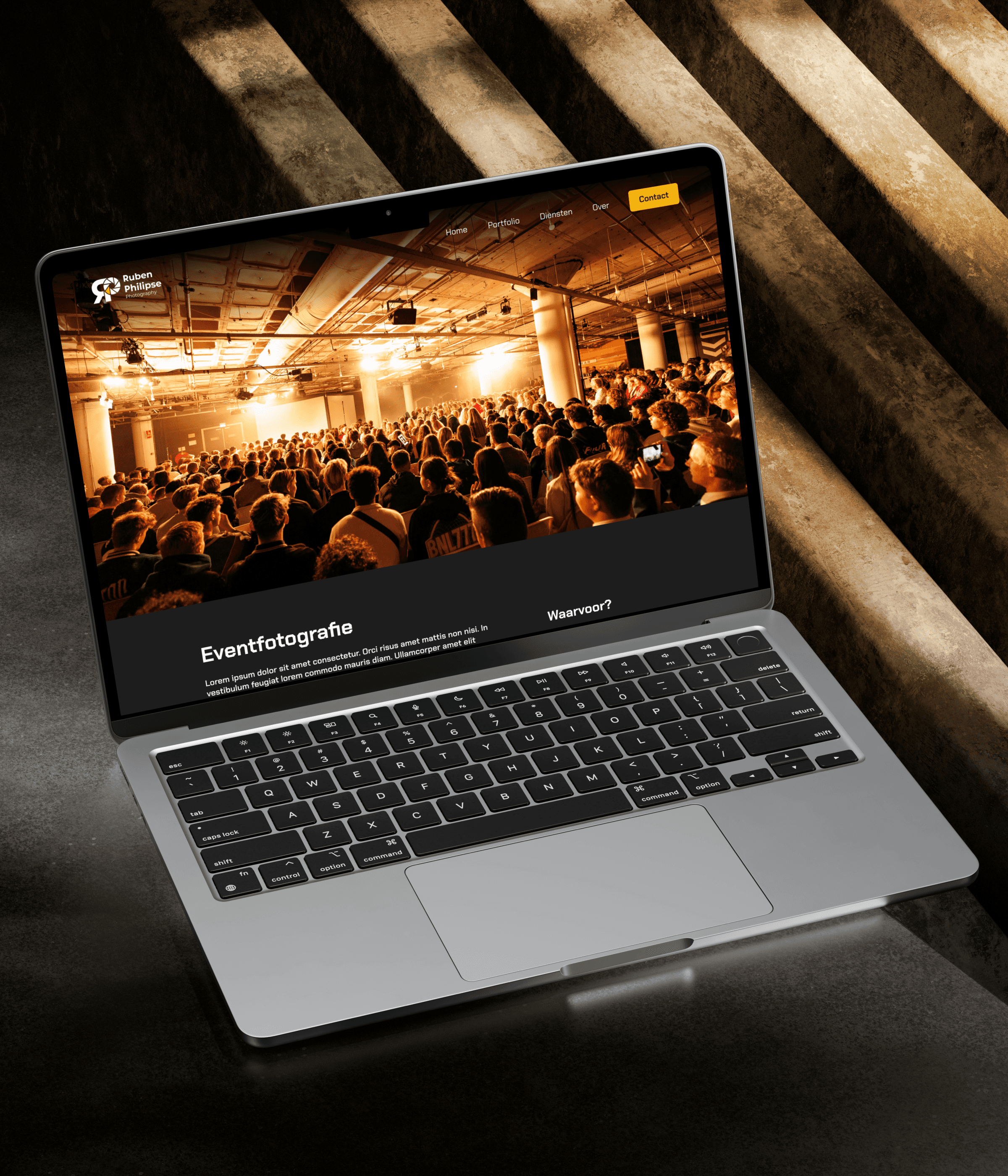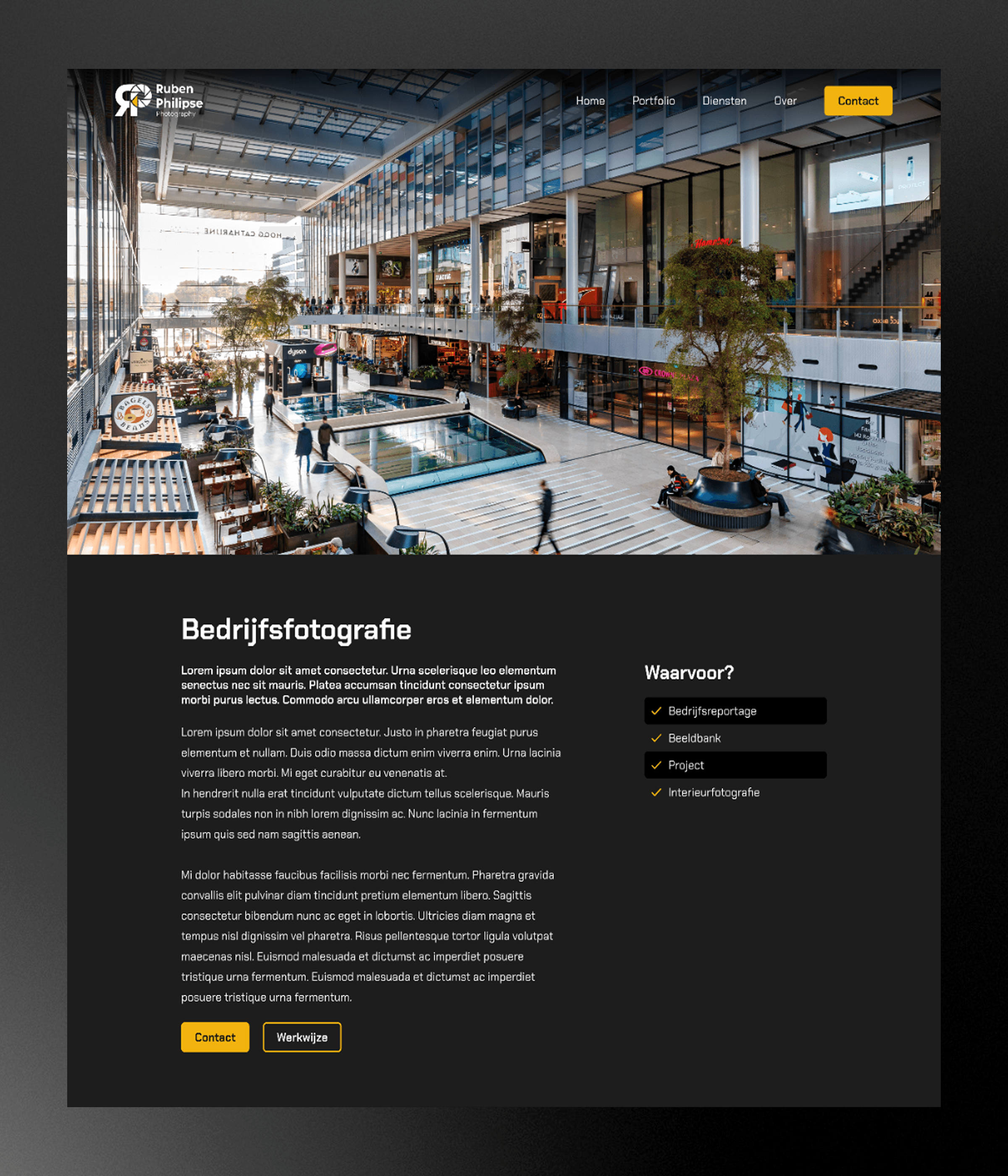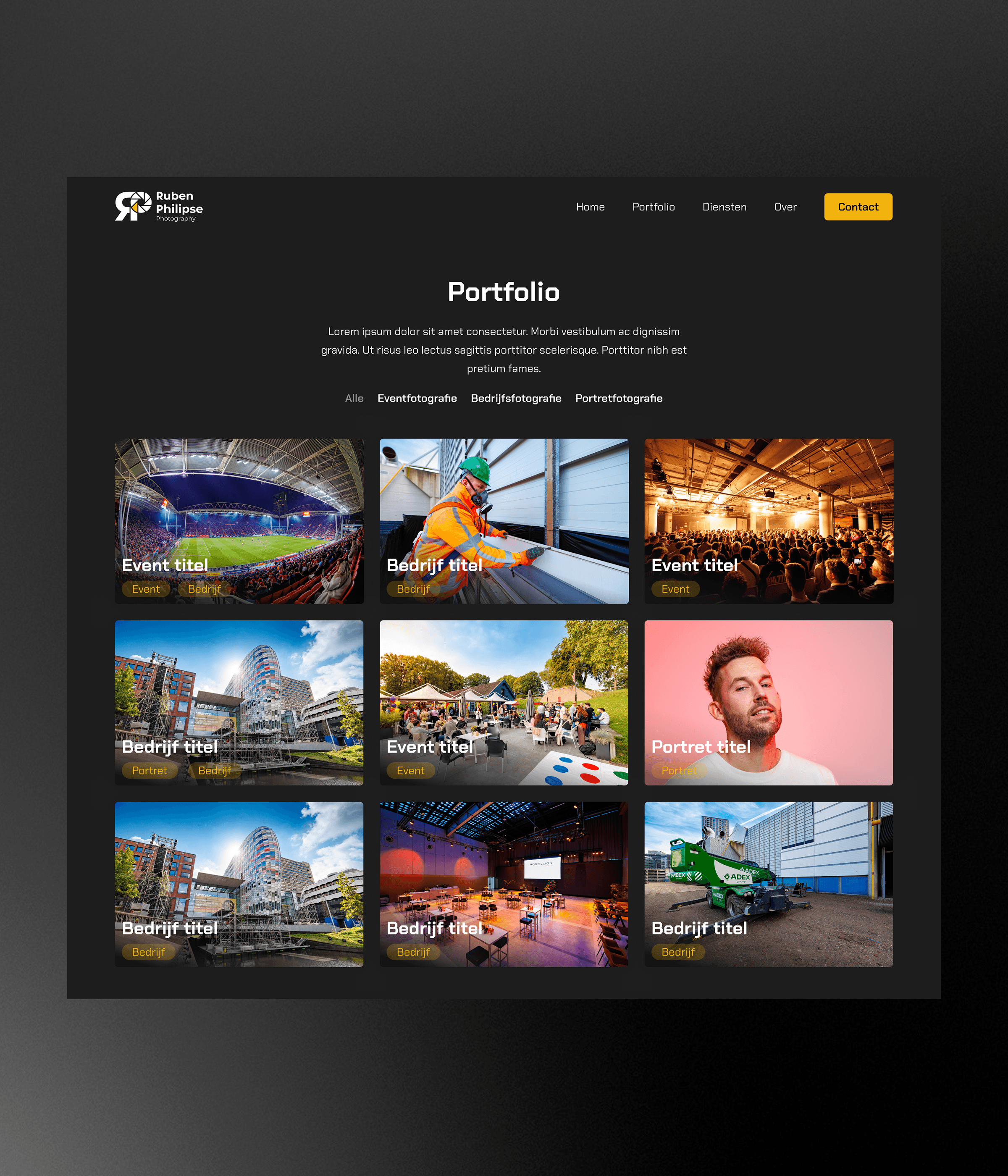 For photographer Ruben Philipse, I designed a professional and bold website that reflects his style and workflow. The dark visual identity, sharp shapes, strong typography and an accent color create a powerful look, while a clear structure ensures his vibrant photography and key pages such as home, services and portfolio stand out.