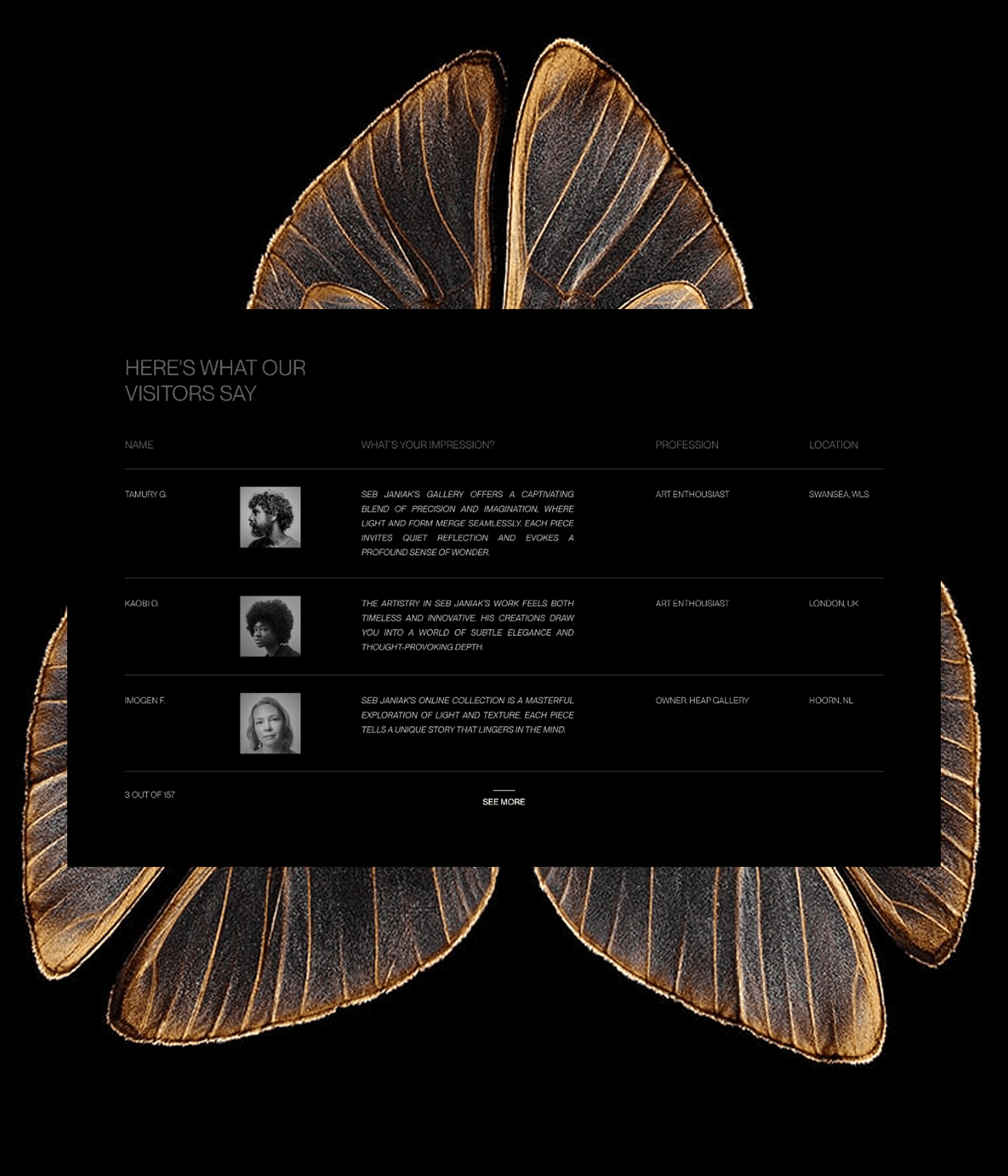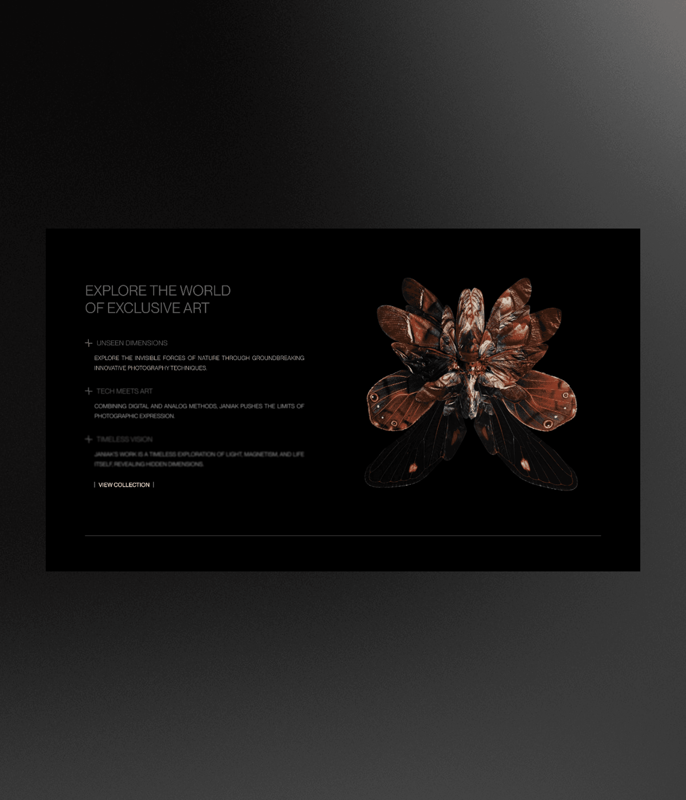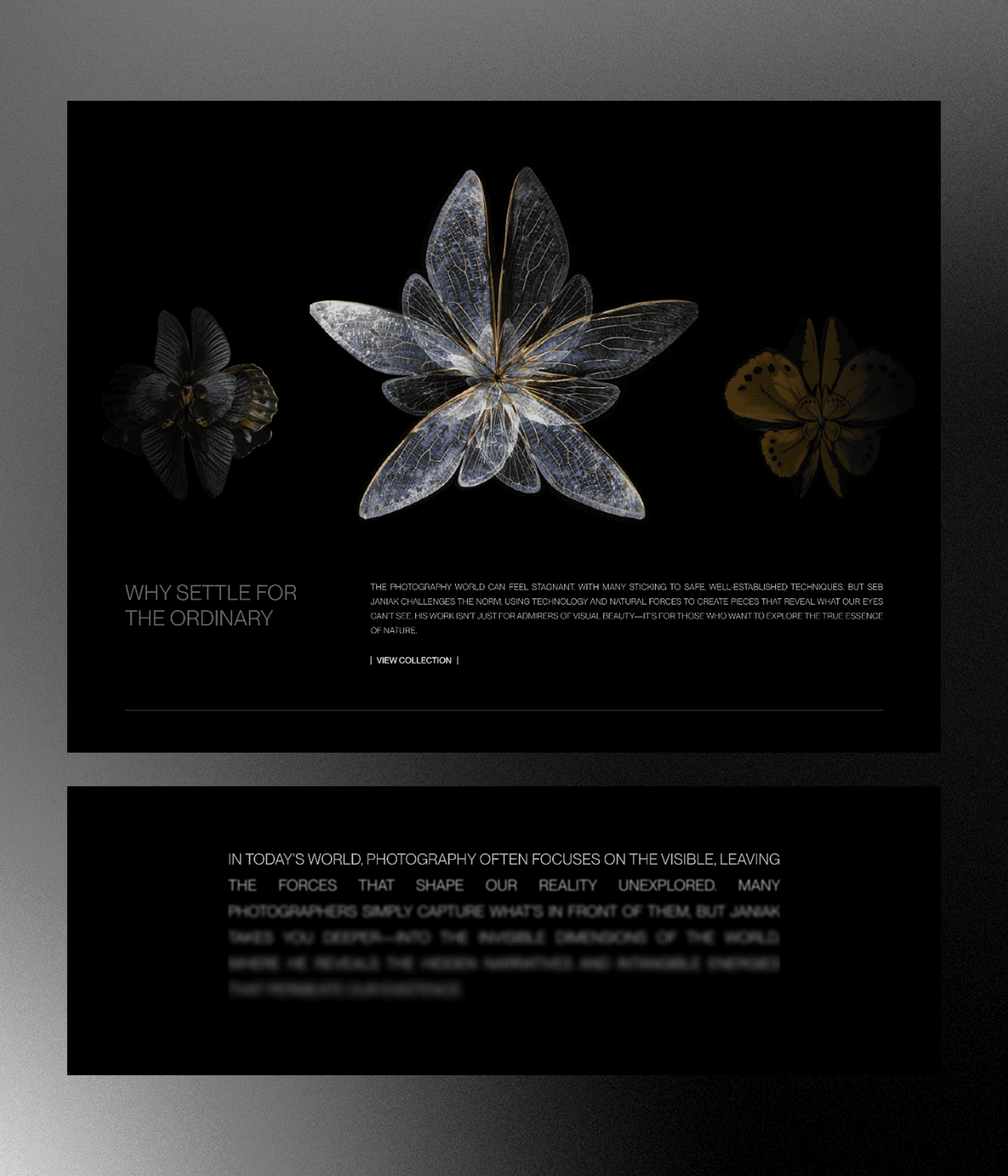 During my internship, I created a fictional website for artist Seb Janiak in Webflow to practice building functional websites. The design is minimalistic and dark, using straight lines to contrast his dynamic floral artworks. This project allowed me to showcase his art while learning Webflow from start to finish.